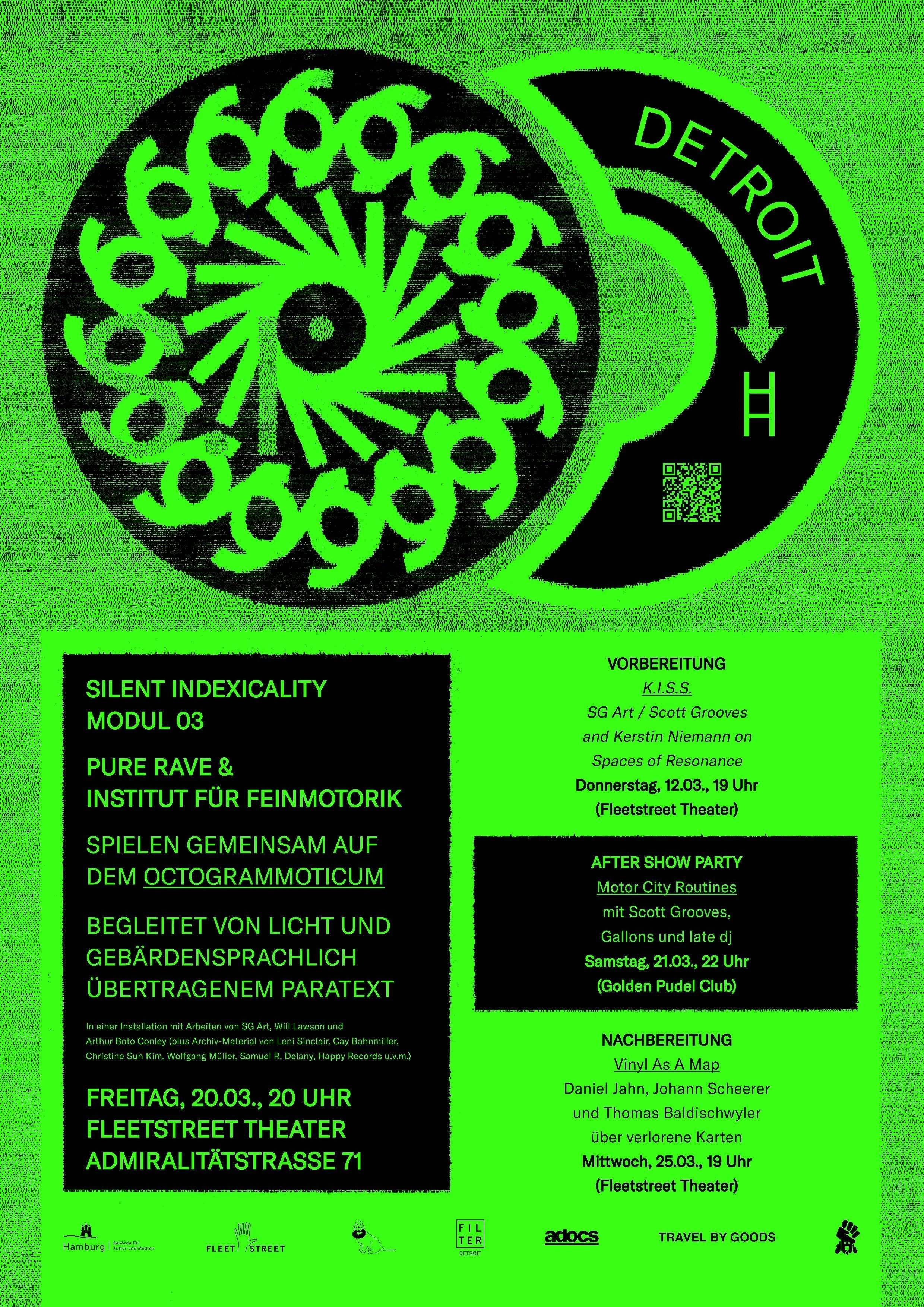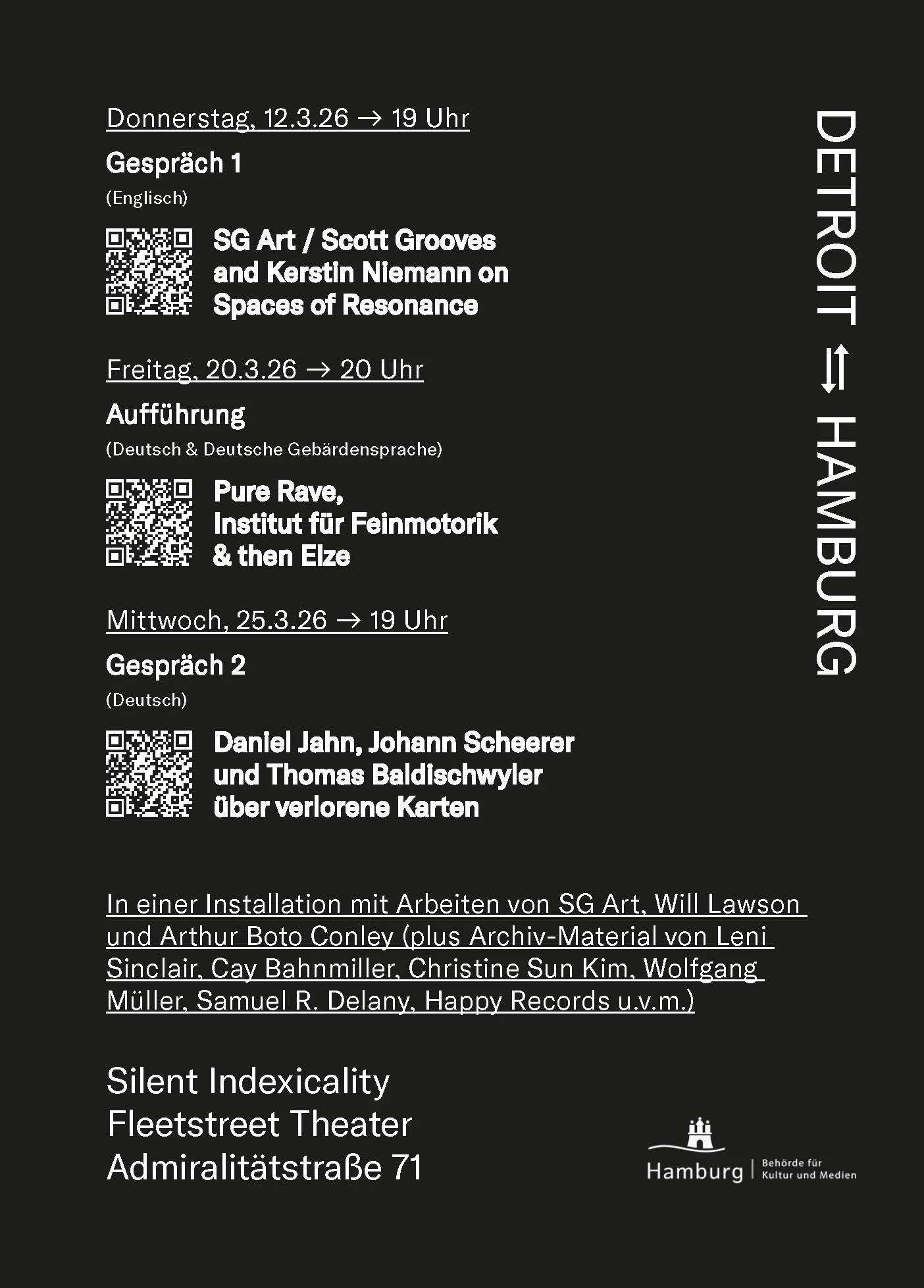 Silent Indexicality is a three-part exchange project between cultural producers in Hamburg and Detroit. It began with research and collaborations in Detroit, continued as a remote development phase in both cities, and concludes with a presentation at Hamburg’s Fleetstreet Theater.