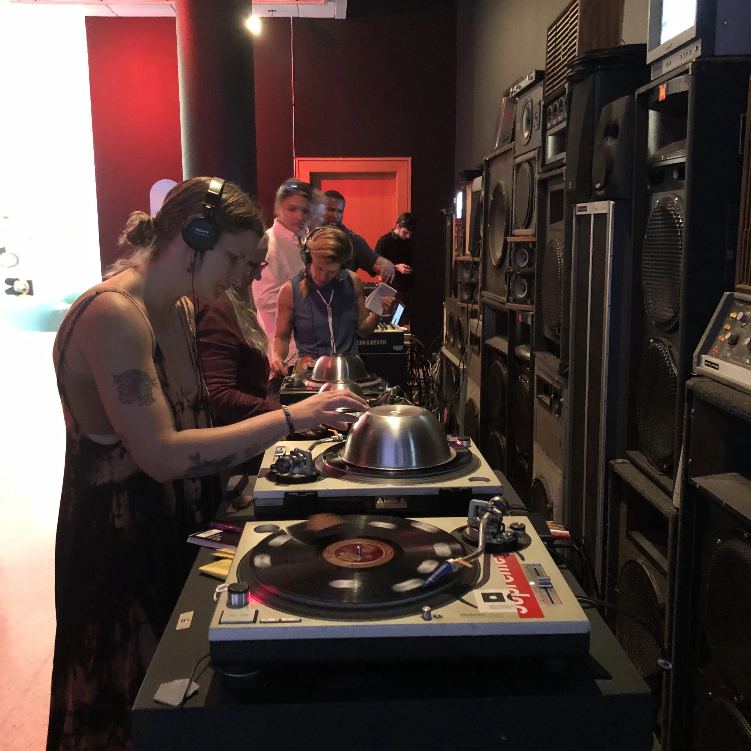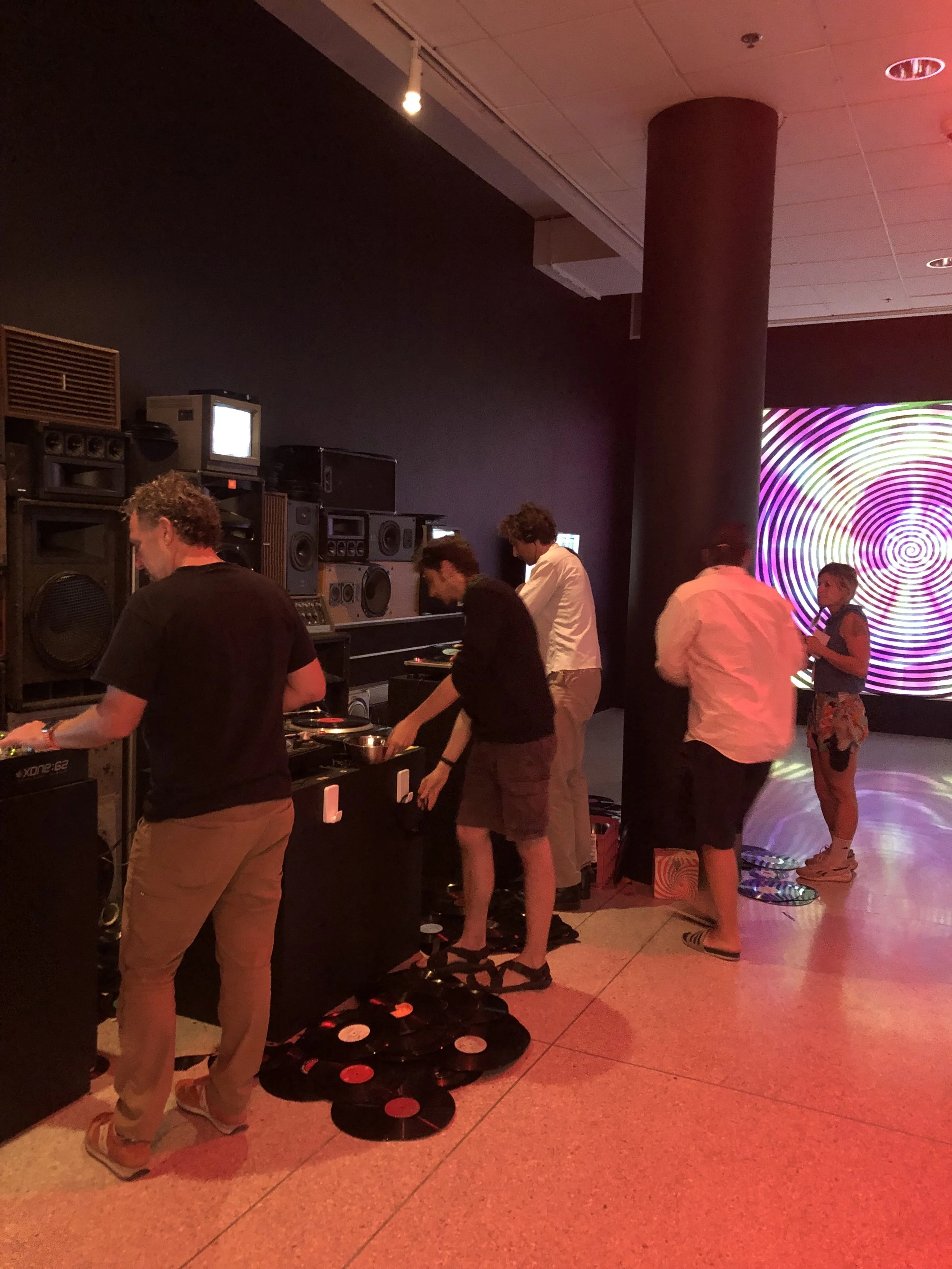 Bei der Perfomance gibt es Geräusche von Schall·Platten·Spielern.